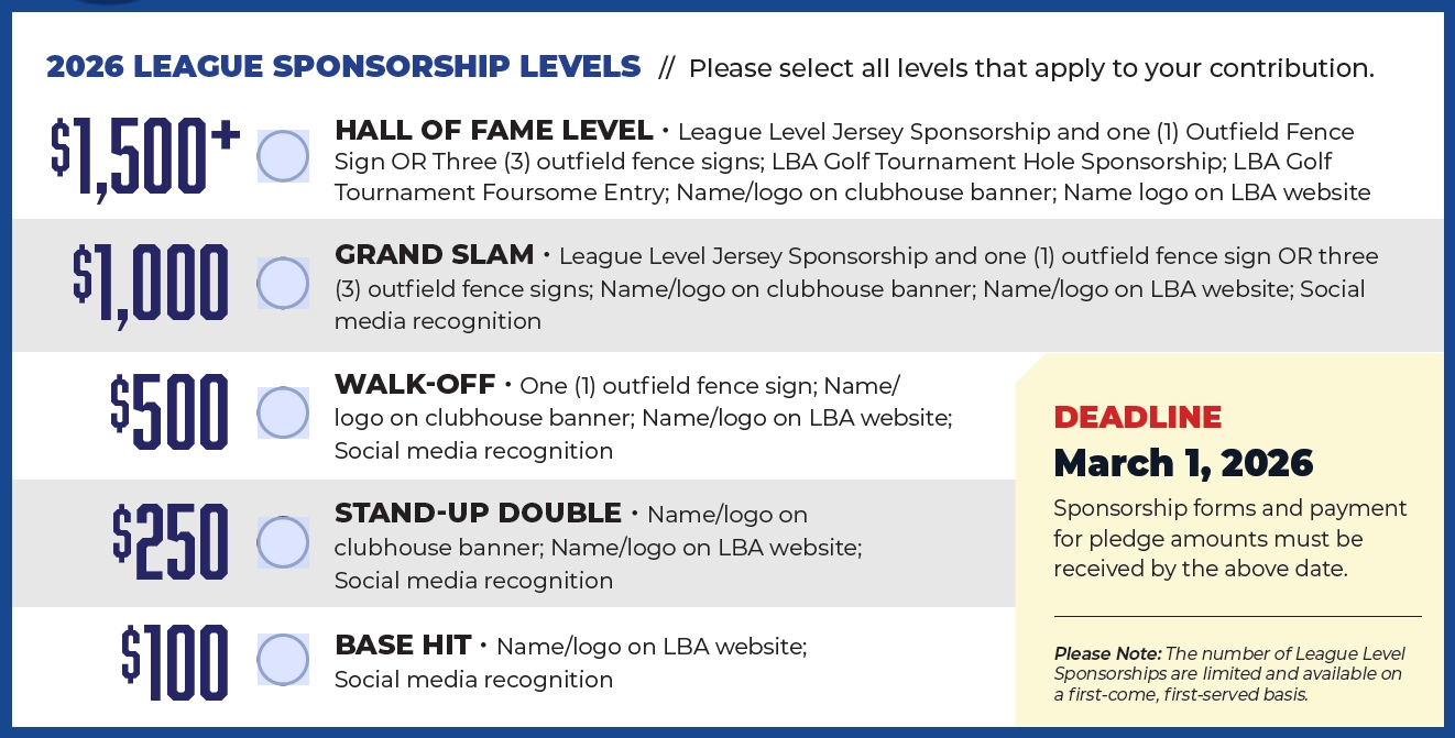 All sponsorship forms and money must be received by March 1, 2026. There are a limited number of League Level sponsorships and field signs. They are available on a first-come, first-served basis.